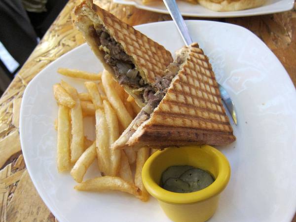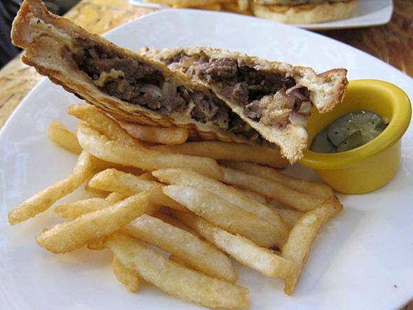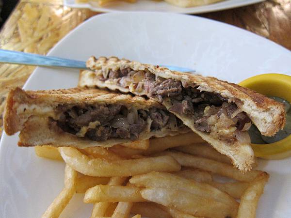 我們點了古達起司牛肉三明治,瘋狂匹茲堡,然後+30元加點一杯水果茶