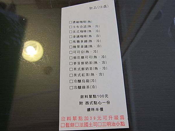 也可以點飲料100元,加39元有鬆餅,法國吐司跟三明治小點