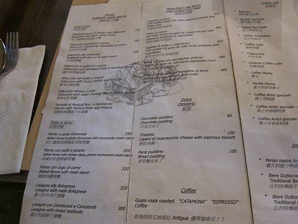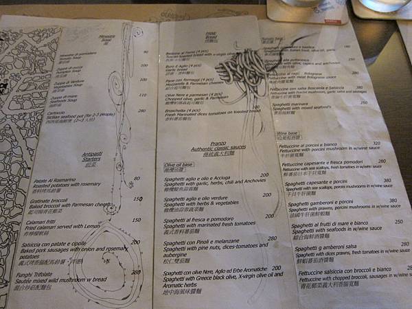 有橄欖油醬,蕃茄醬,白葡萄酒醬,奶油白醬跟奶酪烤麵,價位大概在180~380