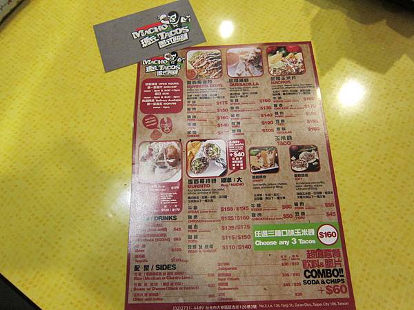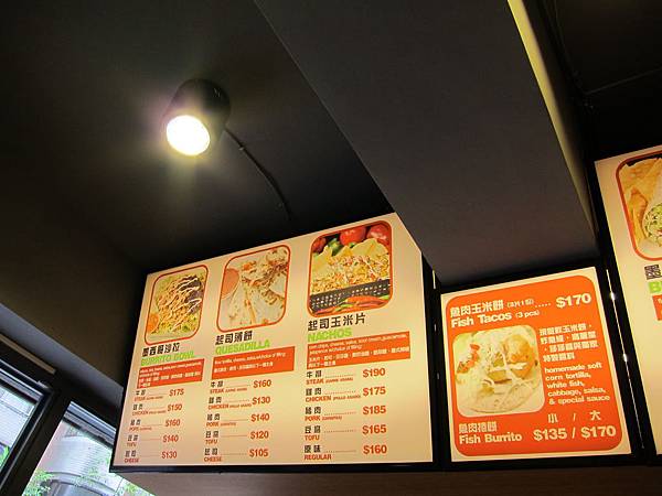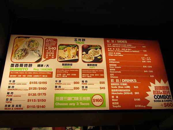 墨西哥捲餅(Burrito)(有標準跟加大),玉米餅(Taco)(有酥脆餅皮跟香軟餅皮)