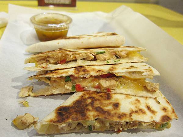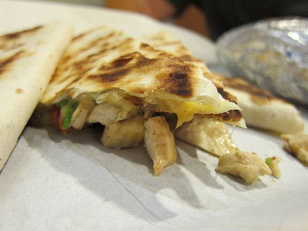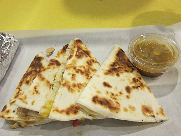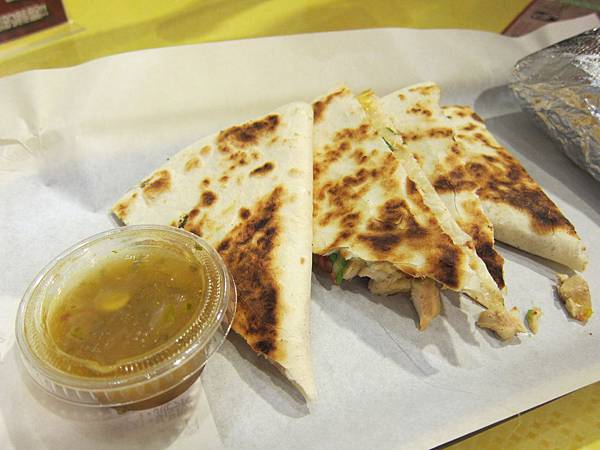 我們點了一個起司薄餅(雞肉)跟一個墨西哥捲餅(牛排)搭配墨西哥飯跟花豆,然後+10元加了酸奶油醬