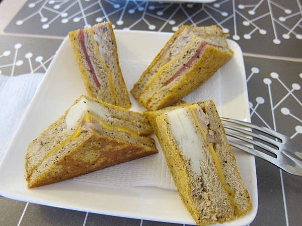 吐司外層應該是有裹蛋液跟一點糖,所以吃起來有微微的甜味,很像法式土司~