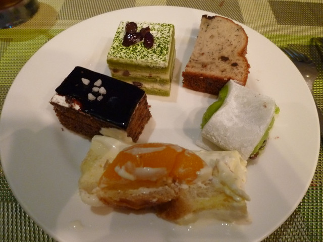 分別是巧克力蛋糕,抹茶紅豆蛋糕,香蕉蛋糕,紅豆麻糬,布丁麵包(吧?!)