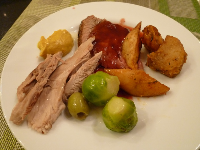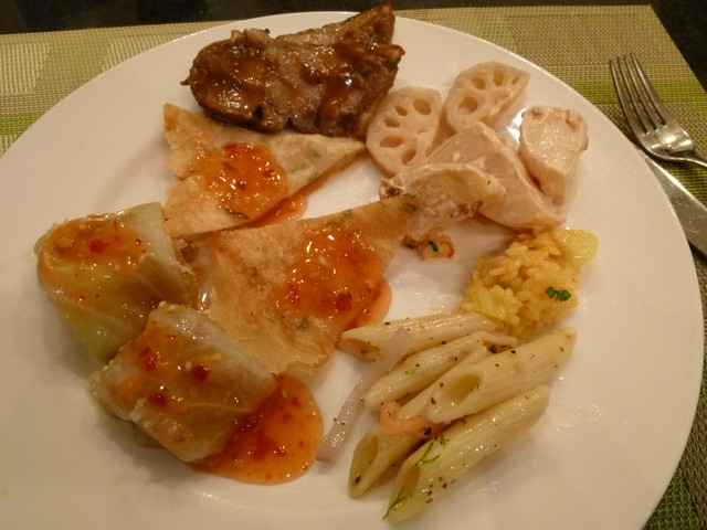 羊肉(一樣忘了名字),醋漬蓮藕,馬鈴薯沙拉,鬱金香火腿炒飯,義大利麵沙拉