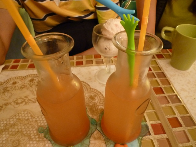 圖說...兩杯果汁的攪拌棒要擊掌~絕對沒有藍綠情結喔XD!