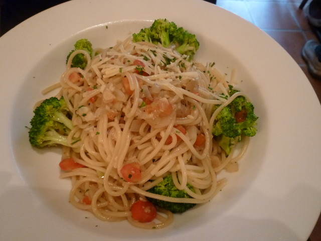 我點蒜香辣味雞肉麵(細麵),大嬸點蒜香鯷魚花椰麵(細麵)